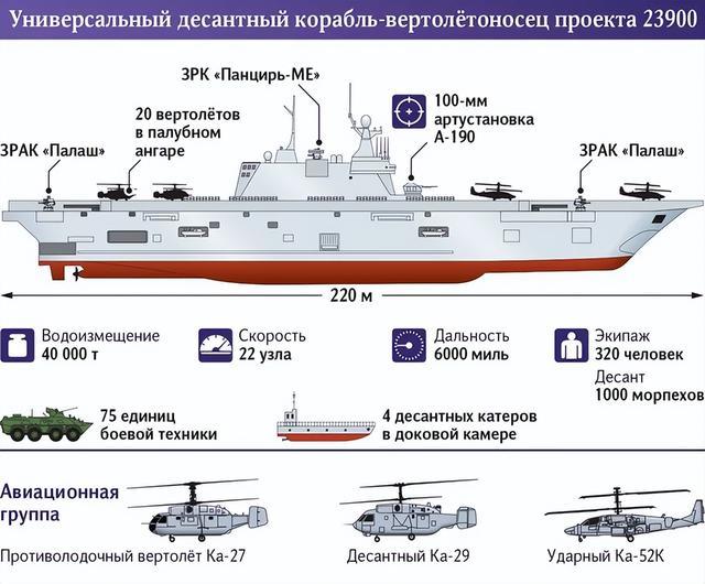 在战后的总结中,俄罗斯高层认为,如果当时有技术性能领先的两栖攻击舰,那么俄海军部队登陆的时间就可以被压缩到40分钟以内。因为大型的两栖攻击舰可以搭载16~20架直升机,携带1000名海军陆战队官兵和70多辆装甲车,还具备对于这些部队的指挥能力,时任俄罗斯的海军总司令维索茨基便公开表示,俄需要这样的武器。